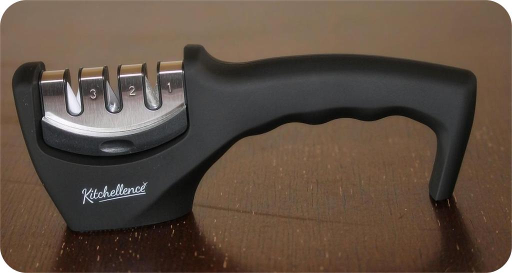 I’ll admit, I’m no good with sharpening stones—they intimidate me. So I decided to order a handheld sharpener to tide us over: the Kitchellence 3‑Stage Knife Sharpener. I’d seen glowing reviews—it’s well-built, intuitive, and got almost 20,000 five-star reviews on Amazon.